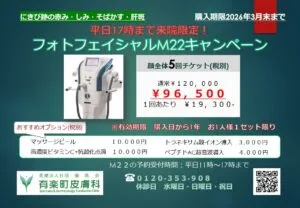 当院人気施術フォトフェイシャルM22のキャンペーン始まります。